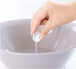 清潔な洗面器等にファーメントパウダー1ピース(0.3g)を約50〜80ccのぬるま湯(36〜40℃目安)に入れてよく溶かします。